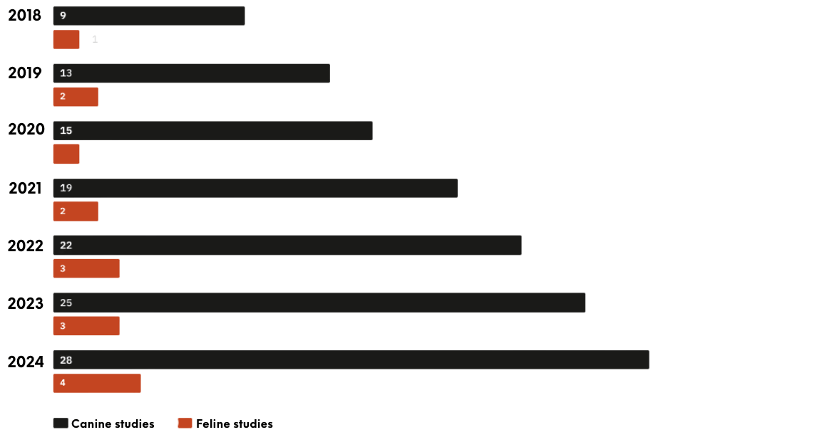 Peer-reviewed CBD companion animal studies published per year, 2018–2024. Source: PubMed/CAB Abstracts search, peer-reviewed only. Estimates based on available literature; exact counts vary by search methodology.